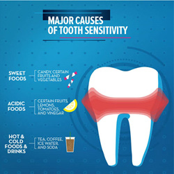 Sensitive teeth pain occurs when your enamel or softer root cementum is worn down or your gum line has receded to expose what is called dentin. Dentin contains cylindrical tubules that run from the center of the tooth (or the “pulp”) where the nerves are located. When the dentin surface is exposed, dentin fluid flows outward from the pulp. If this flow is disrupted by external stimuli (such as hot or cold, sweet or sour foods and drinks) a signal is sent to the nerves which is felt as pain.