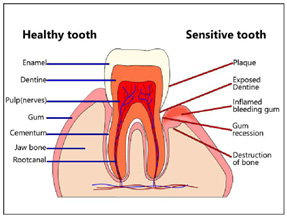 In a healthy mouth, there are tiny tubules in dentin (the soft part inside a tooth) that are covered by gums, cementum (a hard layer of tissue), or enamel. These dentin tubules lead to nerves and if enamel, cementum or gums start to wear away, tubules are open (exposed), so stimuli like temperature changes in the mouth from hot soup, cold ice cream, or even cold air, can move through them to the nerves. This causes the shooting pain known as tooth sensitivity.
